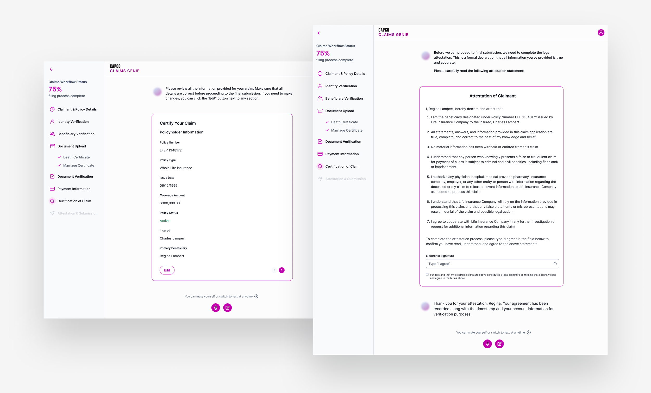 I defined the brand look and feel for Claims Genie and laid the foundation for Capco’s Genie design system—establishing visual standards, reusable components, and interaction patterns that not only created a cohesive experience but also set the stage for scalable, AI-driven product design.