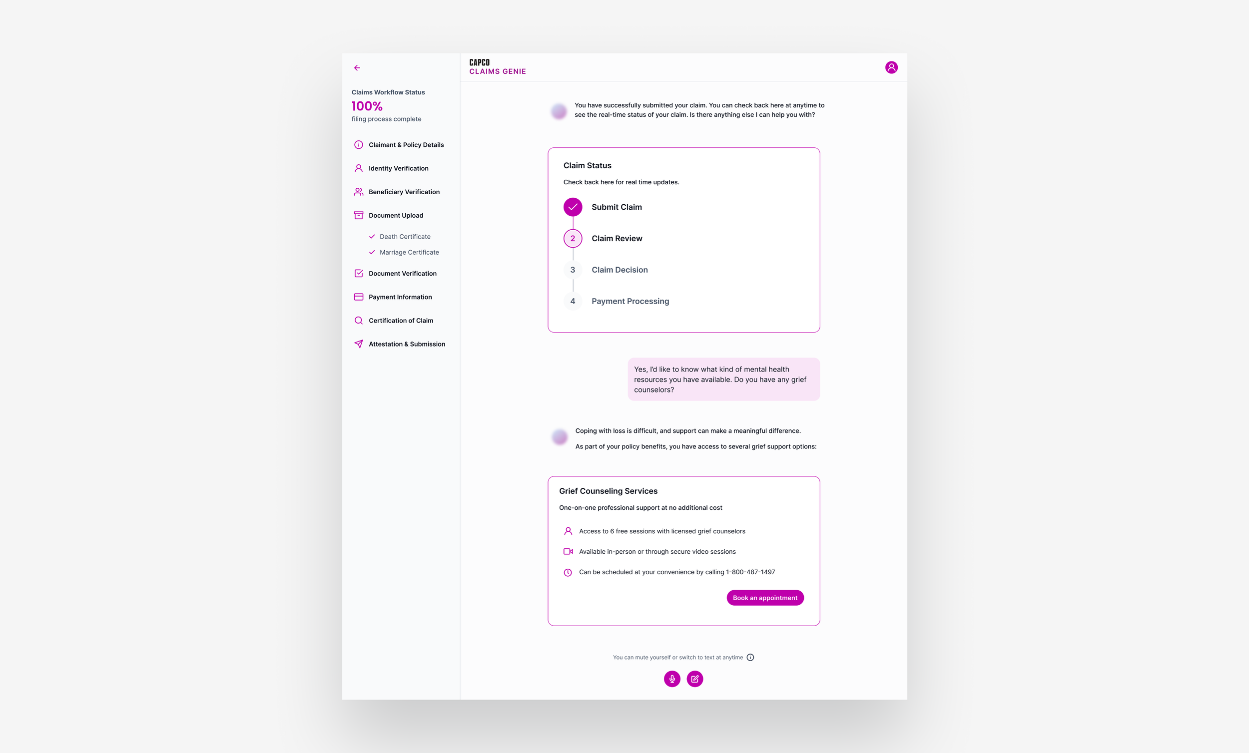 Claims Genie uses conversational cues and supportive microcopy to guide users through complex steps with empathy. The AI provides